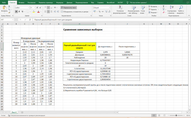 Приводится расчет парного двухвыборочный t-тест для средних.