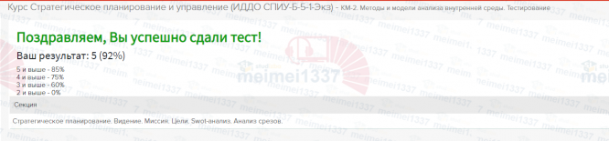 Для студентов ИДДО НИУ «МЭИ» по предмету Стратегическое планирование и управлениеКМ-2. Методы и модели анализа внутренней среды. Тестирование - 92%КМ-2. Методы и модели анализа внутренней среды. Тестирование - 92%