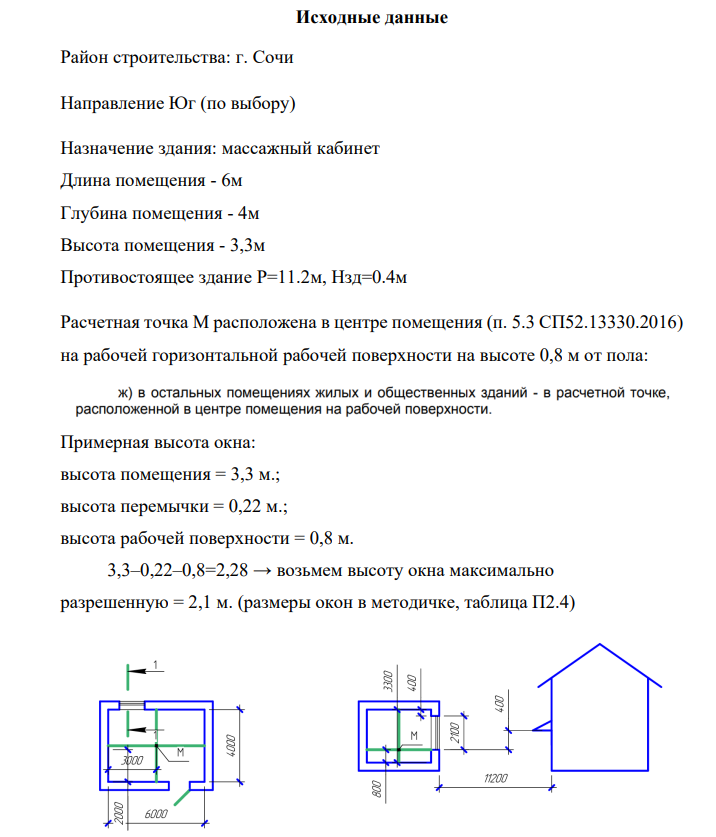 Расчетная точка M расположена в центре помещения (п. 5.3 СП52.13330.2016) на рабочей горизонтальной рабочей поверхности на высоте 0,8 м от пола: