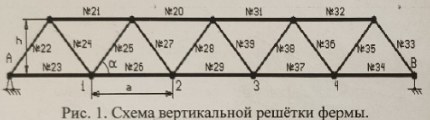 Построение линий влияния в стержнях фермы.