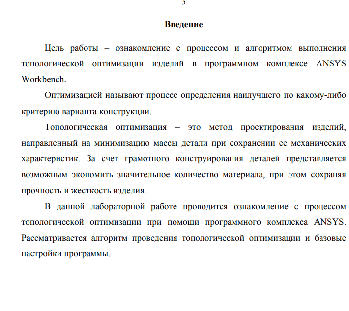 Цель работы – ознакомление с процессом и алгоритмом выполнения топологической оптимизации изделий в программном комплексе ANSYS Workbench. Оптимизацией называют процесс определения наилучшего по какому-либо критерию варианта конструкции. Топологическая оптимизация – это метод проектирования изделий, направленный на минимизацию массы детали при сохранении ее механических характеристик. За счет грамотного конструирования деталей представляется возможным экономить значительное количество материала, при этом сохраняя прочность и жесткость изделия. В данной лабораторной работе проводится ознакомление с процессом топологической оптимизации при помощи программного комплекса ANSYS. Рассматривается алгоритм проведения топологической оптимизации и базовые настройки программы.