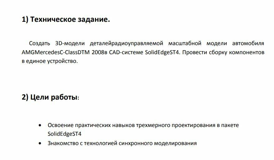 Создать 3D-модели деталейрадиоуправляемой масштабной модели автомобиля AMGMercedesC-ClassDTM 2008в CAD-системе SolidEdgeST4. Провести сборку компонентов в единое устройство. 2) Цели работы: Освоение практических навыков трехмерного проектирования в пакете SolidEdgeST4 Знакомство с технологией синхронного моделирования