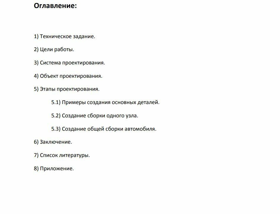 1) Техническое задание. 2) Цели работы. 3) Система проектирования. 4) Объект проектирования. 5) Этапы проектирования. 5.1) Примеры создания основных деталей. 5.2) Создание сборки одного узла. 5.3) Создание общей сборки автомобиля. 6) Заключение. 7) Список литературы. 8) Приложение