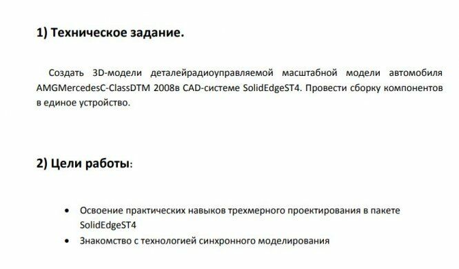 Создать 3D-модели деталейрадиоуправляемой масштабной модели автомобиля AMGMercedesC-ClassDTM 2008в CAD-системе SolidEdgeST4. Провести сборку компонентов в единое устройство. 2) Цели работы:  Освоение практических навыков трехмерного проектирования в пакете SolidEdgeST4  Знакомство с технологией синхронного моделирования