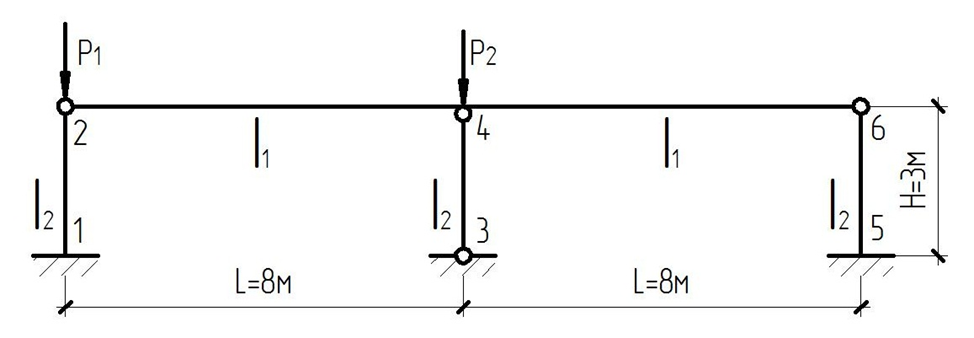 Для студентов по предмету Строительная механикаРасчет плоской рамы на устойчивость методом перемещений.Расчет плоской рамы на устойчивость методом перемещений.