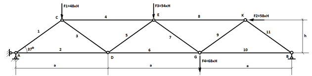 Определить усилия в стержнях фермы, подобрать сечение профиля для изготовления стержней фермы. Размеры и приложенные к ферме нагрузки указаны на расчетной схеме. Угол между осью крайних подкосов и осью нижнего пояса составляет 37°. Ширина панели а = 4 м; Нагрузки, приложенные в узлах фермы: F1 = 48 кН; F2 = 58 кН; F3 = 54 кН; F4 = 68 кН