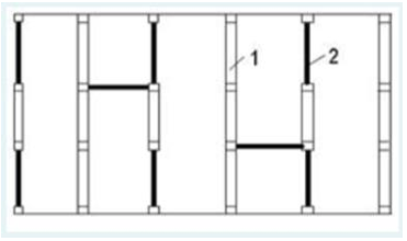 По какой схеме работает каркас здания приведенный на рисунке в поперечном направлении (1 – рамы, 2 – диафрагмы)?