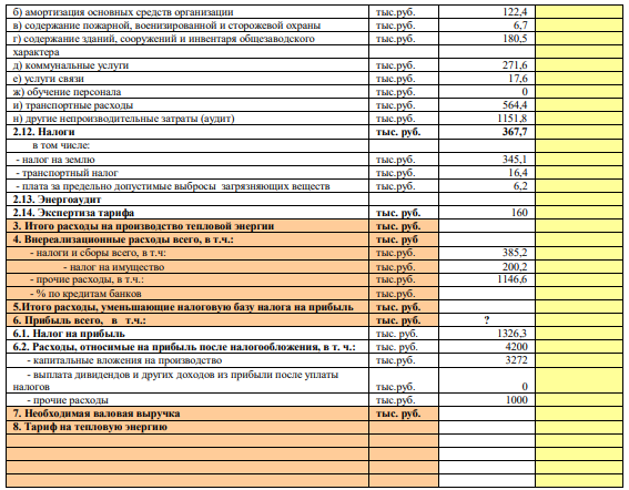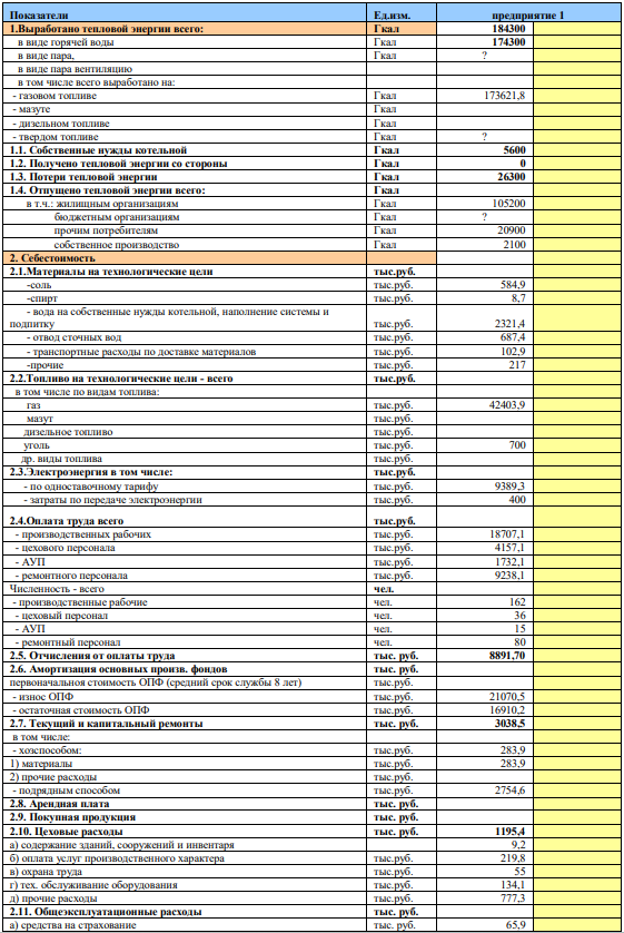 Расчетное задание Дана следующая информация по издержкам предприятия. Срок службы оборудования 10 лет. Линейный способ начисления амортизации. Заполните таблицу себестоимости. Рассчитайте одноставочный и двуставочный тариф на тепловую энергию.