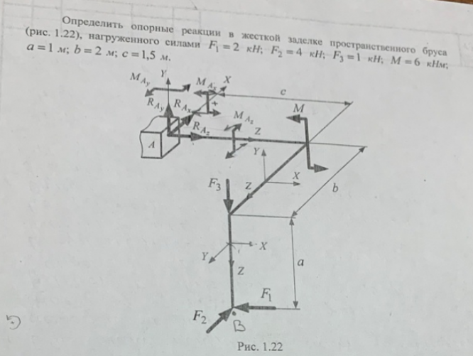 Определить опорные реакции в жесткой заделке пространственного бруса нагруженного силами
