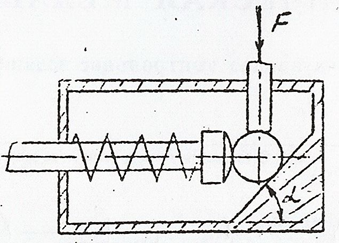Определить аналитически и графически усилие в пружине и силу давления шарика на наклонную плоскость, пренебрегая трением и весом частей устройства, если a=55°.