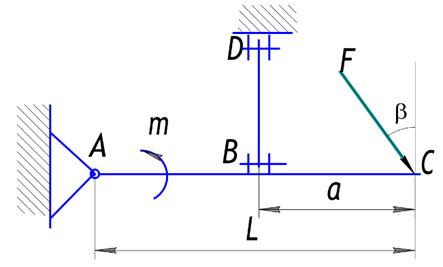 Исходные данные: F =6 кН, m =2,5 кНм, β=65 град, а=0,3 м, ℓ =1,4 м.