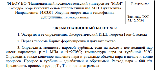 ФГБОУ ВО "Национальный исследовательский университет "МЭИ" Кафедра Теоретических основ теплотехники им. М.П. Вукаловича Направление: 14.03.01 Ядерная энергетика и теплофизика Дисциплина: Термодинамика Утверждаю: Зав. каф. ТОТ 25.12.2024 ЭКЗАМЕНАЦИОННЫЙ БИЛЕТ №12 1. Эксергия и ее определения. Эксергетический КПД. Теорема Гюи-Стодола 2. Первая теорема Карно: формулировка и доказательство. 3. Определить мощность паровой турбины, если на входе в нее водяной пар имеет параметры р1=1 МПа и t1=270°С; температура пара за турбиной 30°С. Определить также конечное давление пара и удельные объемы пара в начале и конце процесса. Процесс в турбине – адиабатный и обратимый. Расход пара – 600 т/ч. Представить процесс в р,v-, р,Т-, Т,s- и h,s- диаграммах