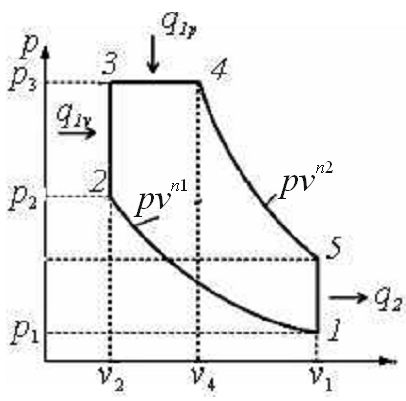 ДВС работает по циклу со смешанным подводом теплоты. Качественная диаграмма цикла в рv- координатах приведена на рис. 1.