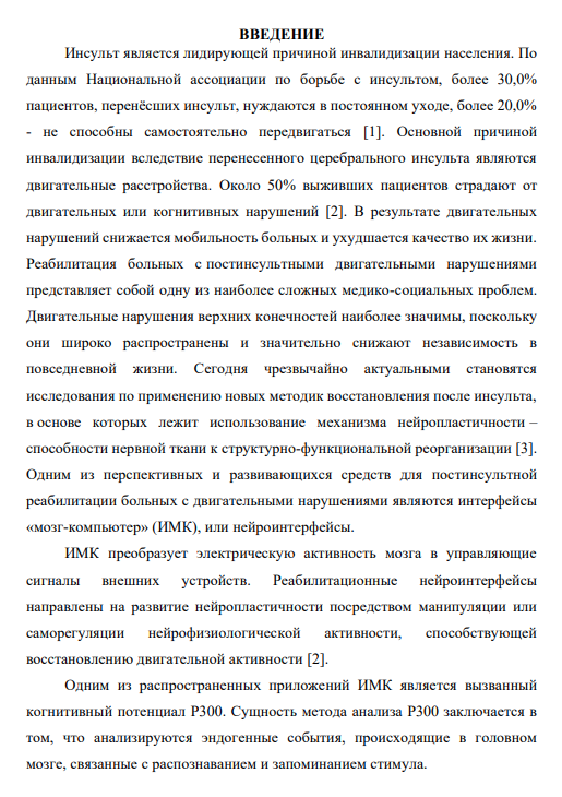 Инсульт является лидирующей причиной инвалидизации населения. По данным Национальной ассоциации по борьбе с инсультом, более 30,0% пациентов, перенёсших инсульт, нуждаются в постоянном уходе, более 20,0% - не способны самостоятельно передвигаться [1]. Основной причиной инвалидизации вследствие перенесенного церебрального инсульта являются двигательные расстройства. Около 50% выживших пациентов страдают от двигательных или когнитивных нарушений [2]. В результате двигательных нарушений снижается мобильность больных и ухудшается качество их жизни. Реабилитация больных с постинсультными двигательными нарушениями представляет собой одну из наиболее сложных медико-социальных проблем. Двигательные нарушения верхних конечностей наиболее значимы, поскольку они широко распространены и значительно снижают независимость в повседневной жизни. Сегодня чрезвычайно актуальными становятся исследования по применению новых методик восстановления после инсульта, в основе которых лежит использование механизма нейропластичности – способности нервной ткани к структурно-функциональной реорганизации [3]. Одним из перспективных и развивающихся средств для постинсультной реабилитации больных с двигательными нарушениями являются интерфейсы «мозг-компьютер» (ИМК), или нейроинтерфейсы