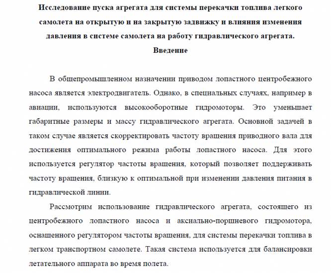 НИР: Исследование работы гидравлического агрегата для перекачки топлива легкого транспортного самолета