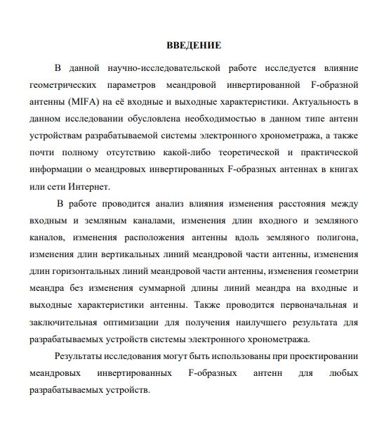 Научно-исследовательская работа "Исследование влияния геометрических параметров меандровой инвертированной F-образной антенны на её входные и выходные характеристики"