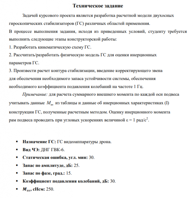 Техническое задание Задачей курсового проекта является разработка расчетной модели двухосных гироскопических стабилизаторов (ГС) различных областей применения. В процессе выполнения задания, исходя из приведенных условий, студенту требуется выполнить следующие этапы конструкторской работы: 1. Разработать кинематическую схему ГС. 2. Рассчитать/разработать физическую модель ГС для оценки инерционных параметров ГС. 3. Произвести расчет контура стабилизации, введение корректирующего звена для обеспечения необходимого запаса устойчивости системы, обеспечения необходимого коэффициента подавления колебаний на частоте 1 Гц. Примечание: для расчета суммарного внешнего момента по каждой оси подвеса учитывать данные Мвн из таблицы и данные об инерционных характеристиках (I) конструкции ГС, полученные расчетным методом. Оценку инерционного момента рам подвеса проводить при угловых ускорениях величиной ε = 1 рад/с2 .