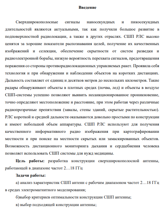 Цель работы: разработка конструкции сверхширокополосной антенны, работающей в диапазоне частот 2…18 ГГц Задачи работы: а) анализ характеристик СШП антенн с рабочим диапазоном частот 2…18 ГГц в средах электромагнитного моделирования; б)выбор критериев оптимальности конструкции СШП антенны; в) выбор подходящей конструкции антенны;