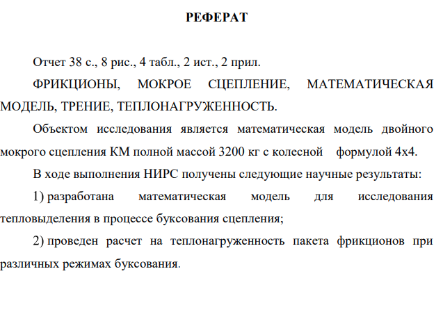 Объектом исследования является математическая модель двойного мокрого сцепления КМ полной массой 3200 кг с колесной формулой 4x4. В ходе выполнения НИРС получены следующие научные результаты: разработана математическая модель для исследования тепловыделения в процессе буксования сцепления; проведен расчет на теплонагруженность пакета фрикционов при различных режимах буксования