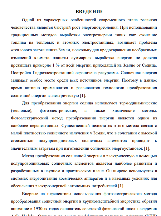 Одной из характерных особенностей современного этапа развития человечества является быстрый рост энергопотребления. При использовании традиционных методов выработки электроэнергии таких как: сжигание топлива на тепловых и атомных электростанциях, возникает проблема «теплового загрязнения» Земли, поскольку для предотвращения необратимых изменений климата планеты суммарная выработка энергии не должна превышать примерно 1 % от всей энергии, приходящей на Землю от Солнца. Постройка Гидроэлектростанций ограничена ресурсами. Солнечная энергия занимает особое место среди всех источников энергии. Поэтому в данное время активно применяются и развиваются технологии преобразования солнечной энергии в электрическую [1]