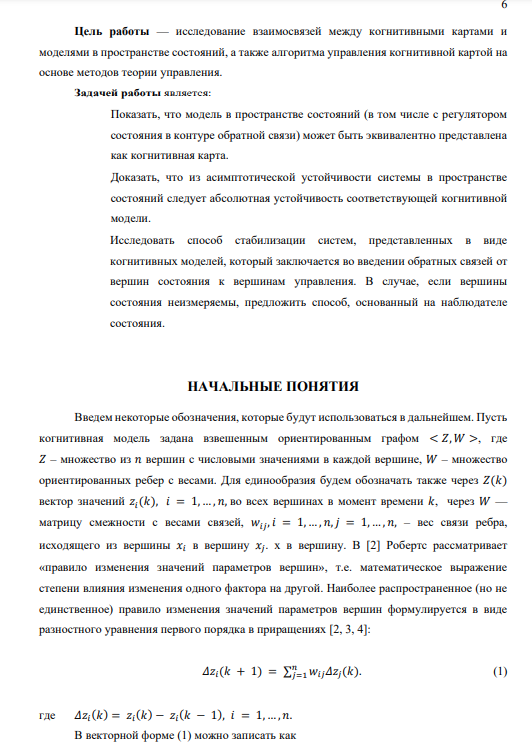Цель работы — исследование взаимосвязей между когнитивными картами и моделями в пространстве состояний, а также алгоритма управления когнитивной картой на основе методов теории управления. Задачей работы является: Показать, что модель в пространстве состояний (в том числе с регулятором состояния в контуре обратной связи) может быть эквивалентно представлена как когнитивная карта. Доказать, что из асимптотической устойчивости системы в пространстве состояний следует абсолютная устойчивость соответствующей когнитивной модели. Исследовать способ стабилизации систем, представленных в виде когнитивных моделей, который заключается во введении обратных связей от вершин состояния к вершинам управления. В случае, если вершины состояния неизмеряемы, предложить способ, основанный на наблюдателе состояния.