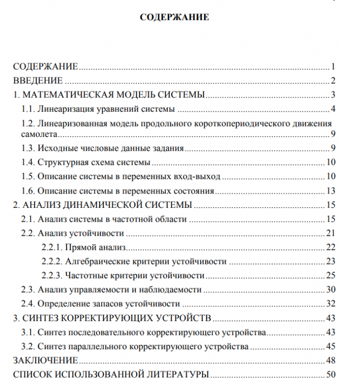 Задача управления летательным аппаратом самолетного типа является очень сложной задачей для оператора. Поэтому актуальной является задача реализации системы автоматического управления самолетом, позволяющей избавить пилота от большой части задач, связанных с процессом управления. В рамках курсовой работы рассматривается частная задача управления самолетом – система стабилизации высоты самолета при помощи руля высоты (стабилизатора), которая обеспечивает стабилизацию и управление угловым движением самолета, т.е. сохранение требуемого его углового положения или его установившегося углового движения. Целью курсовой работы является анализ и синтез системы управления продольным короткопериодическим движением самолета. Для достижения цели необходимо выполнить задачи определения математической модели рассматриваемого объекта, линеаризации системы дифференциальных уравнений, описывающей движение самолета, упрощения системы с учетом рассмотрения частной задачи управления, получения описания системы в переменных вход-выход и переменных состояния, анализа системы в частотной области, анализа устойчивости системы различными методами, анализа управляемости и наблюдаемости системы, определения запасов устойчивости, синтеза последовательного и параллельного корректирующего устройств.