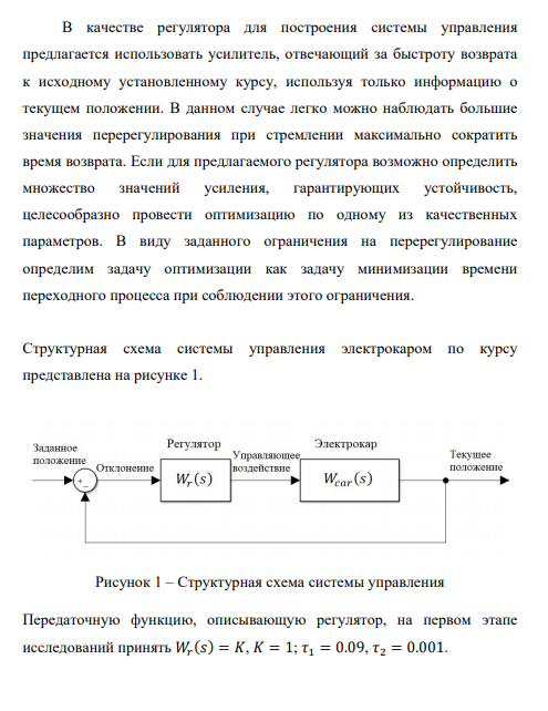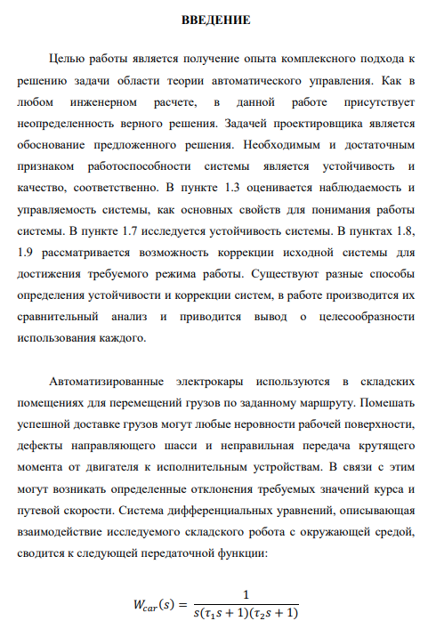 Роботизированное автономное устройство – сложный объект, требующий комплексного подхода с позиции управления. Основной задачей складского робота является перемещение товаров по территории склада и их выгрузка. На непосредственное перемещение по территории уходит большая часть времени работы электрокара, следовательно, эта операция больше подвержена ошибкам. Обычно склады представляют собой либо помещения коридорного типа, либо полностью открытые территории. В обоих вариантах удобен прямолинейный вид перемещения, в котором наиболее распространенной ошибкой является отклонение от заданного направления движения. В данной работе исследуется модель системы управления электрокаром по курсу, рассматривается способ повышения качества работы приведенной системы и ее устойчивости к внешним возмущающим факторам. Преимущества корректно работающего устройства очевидны, именно поэтому автономные складские роботы широко распространены в настоящее время. Работа состоит из 44 страниц, содержит 17 иллюстраций и 2 литературных источника.