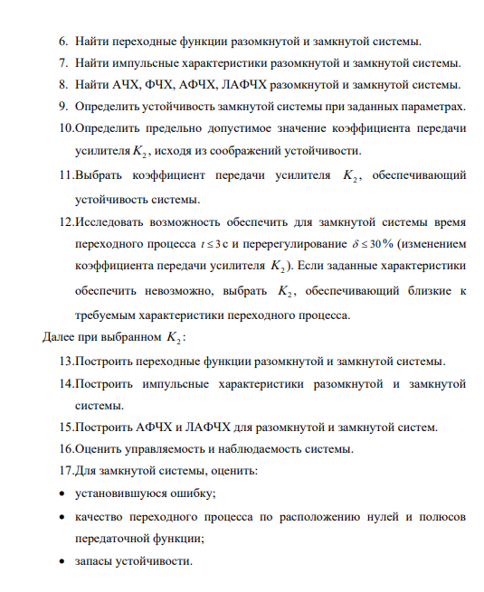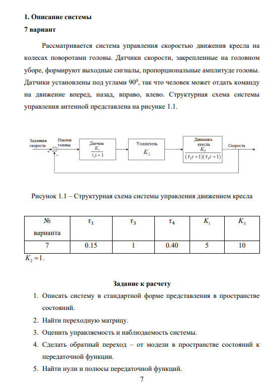 В работе исследуется система управления движения кресла. Целью данного проекта является изучение вариантов математического описания динамической системы, исследование устойчивости динамической системы, используя различные формы представления и критерии, а также оценивание качества динамической системы. Проводится анализ системы на наблюдаемость и управляемость. Динамическая система характеризуется и оценивается с помощью основных параметров – устойчивость и качество. Эти параметры являются одними из важнейших условий ее работоспособности. К данной системе применяются алгебраические, частотные критерии для обеспечения устойчивости в зависимости от коэффициента усиления. Затем проводится анализ на ее качество (точность системы, время переходного процесса, перерегулирование) при изменении коэффициента усиления. В работе используются методы Гурвица, Михайлова, Найквиста для оценки устойчивости системы и метод корневого годографа для оценки качества