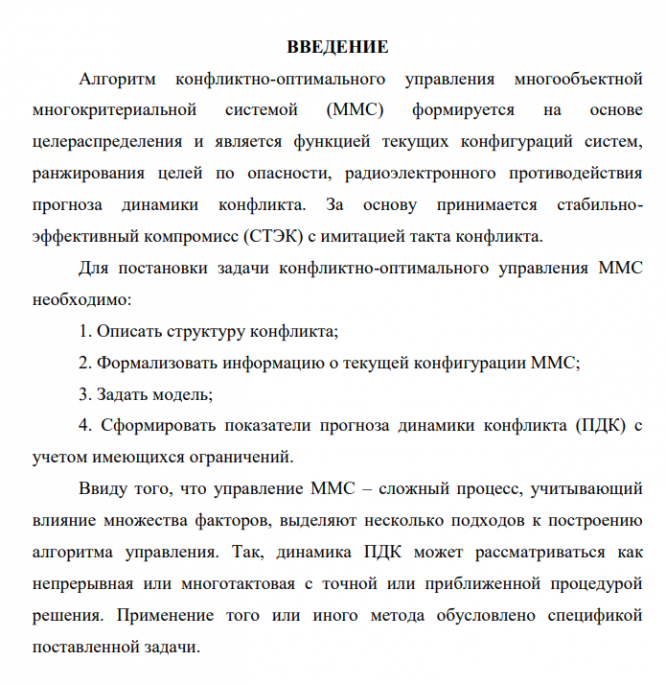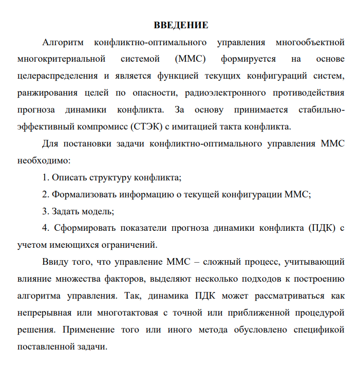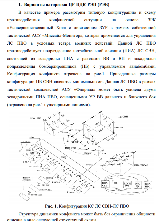 Алгоритм конфликтно-оптимального управления многообъектной многокритериальной системой (ММС) формируется на основе целераспределения и является функцией текущих конфигураций систем, ранжирования целей по опасности, радиоэлектронного противодействия прогноза динамики конфликта. За основу принимается стабильноэффективный компромисс (СТЭК) с имитацией такта конфликта. Для постановки задачи конфликтно-оптимального управления ММС необходимо: 1. Описать структуру конфликта; 2. Формализовать информацию о текущей конфигурации ММС; 3. Задать модель; 4. Сформировать показатели прогноза динамики конфликта (ПДК) с учетом имеющихся ограничений. Ввиду того, что управление ММС – сложный процесс, учитывающий влияние множества факторов, выделяют несколько подходов к построению алгоритма управления. Так, динамика ПДК может рассматриваться как непрерывная или многотактовая с точной или приближенной процедурой решения. Применение того или иного метода обусловлено спецификой поставленной задачи.