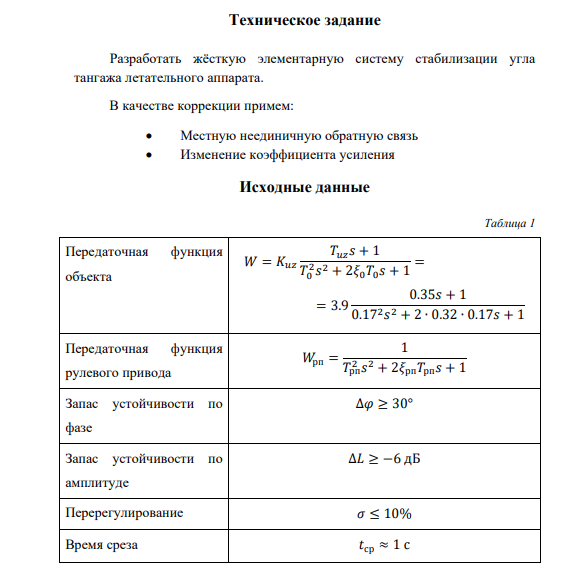 Техническое задание _Разработать элементарную жёсткую систему стабилизации угла тангажа ___