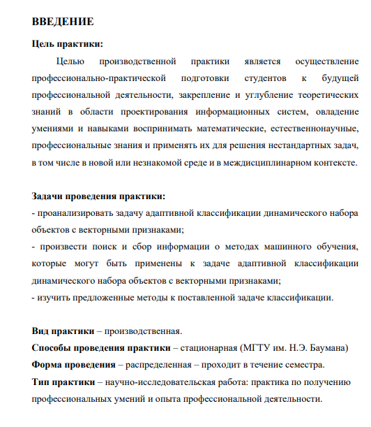 Задачи проведения практики: - проанализировать задачу адаптивной классификации динамического набора объектов с векторными признаками; - произвести поиск и сбор информации о методах машинного обучения, которые могут быть применены к задаче адаптивной классификации динамического набора объектов с векторными признаками; - изучить предложенные методы к поставленной задаче классификации. Вид практики – производственная. Способы проведения практики – стационарная (МГТУ им. Н.Э. Баумана) Форма проведения – распределенная – проходит в течение семестра. Тип практики – научно-исследовательская работа: практика по получению профессиональных умений и опыта профессиональной деятельности.