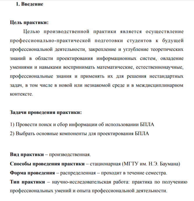 Цель практики: Целью производственной практики является осуществление профессионально-практической подготовки студентов к будущей профессиональной деятельности, закрепление и углубление теоретических знаний в области проектирования информационных систем, овладение умениями и навыками воспринимать математические, естественнонаучные, профессиональные знания и применять их для решения нестандартных задач, в том числе в новой или незнакомой среде и в междисциплинарном контексте. Задачи проведения практики: 1) Провести поиск и сбор информации об использовании БПЛА 2) Выбрать основные компоненты для проектирования БПЛА Вид практики – производственная. Способы проведения практики – стационарная (МГТУ им. Н.Э. Баумана) Форма проведения – распределенная – проходит в течение семестра. Тип практики – научно-исследовательская работа: практика по получению профессиональных умений и опыта профессиональной деятельности.