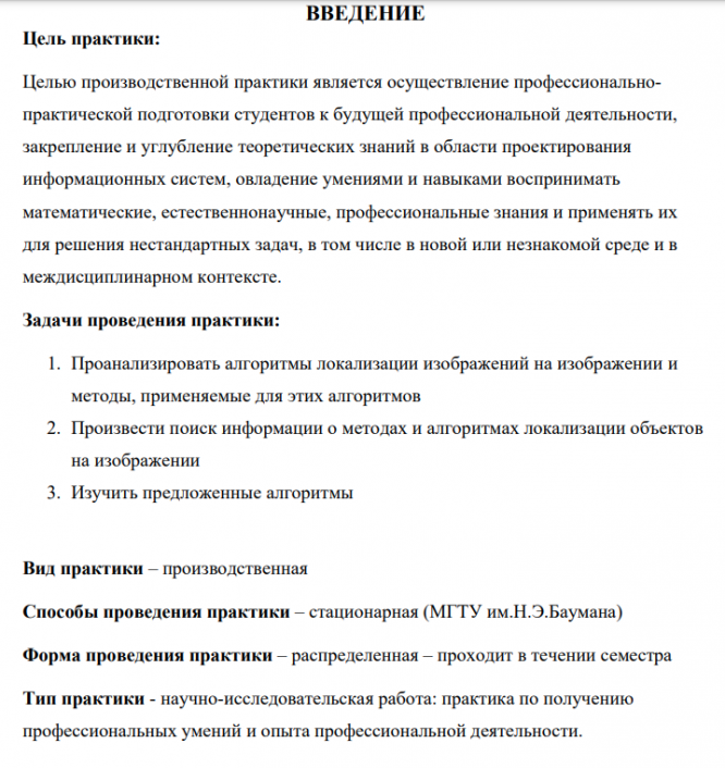 Цель практики: Целью производственной практики является осуществление профессиональнопрактической подготовки студентов к будущей профессиональной деятельности, закрепление и углубление теоретических знаний в области проектирования информационных систем, овладение умениями и навыками воспринимать математические, естественнонаучные, профессиональные знания и применять их для решения нестандартных задач, в том числе в новой или незнакомой среде и в междисциплинарном контексте. Задачи проведения практики: 1. Проанализировать алгоритмы локализации изображений на изображении и методы, применяемые для этих алгоритмов 2. Произвести поиск информации о методах и алгоритмах локализации объектов на изображении 3. Изучить предложенные алгоритмы Вид практики – производственная Способы проведения практики – стационарная (МГТУ им.Н.Э.Баумана) Форма проведения практики – распределенная – проходит в течении семестра Тип практики - научно-исследовательская работа: практика по получению профессиональных умений и опыта профессиональной деятельности.