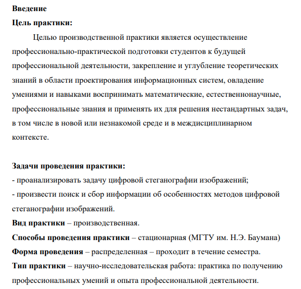 Цель практики: Целью производственной практики является осуществление профессионально-практической подготовки студентов к будущей профессиональной деятельности, закрепление и углубление теоретических знаний в области проектирования информационных систем, овладение умениями и навыками воспринимать математические, естественнонаучные, профессиональные знания и применять их для решения нестандартных задач, в том числе в новой или незнакомой среде и в междисциплинарном контексте. Задачи проведения практики: - проанализировать задачу цифровой стеганографии изображений; - произвести поиск и сбор информации об особенностях методов цифровой стеганографии изображений. Вид практики – производственная. Способы проведения практики – стационарная (МГТУ им. Н.Э. Баумана) Форма проведения – распределенная – проходит в течение семестра. Тип практики – научно-исследовательская работа: практика по получению профессиональных умений и опыта профессиональной деятельности