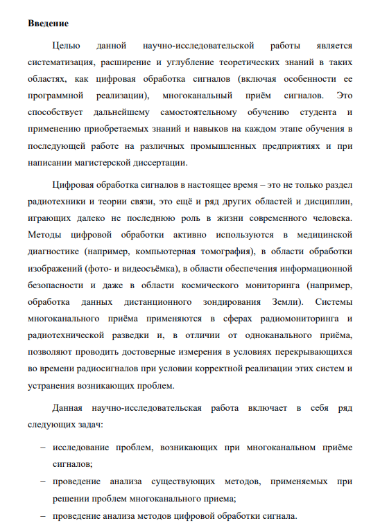 Целью данной научно-исследовательской работы является систематизация, расширение и углубление теоретических знаний в таких областях, как цифровая обработка сигналов (включая особенности ее программной реализации), многоканальный приём сигналов. Это способствует дальнейшему самостоятельному обучению студента и применению приобретаемых знаний и навыков на каждом этапе обучения в последующей работе на различных промышленных предприятиях и при написании магистерской диссертации. Цифровая обработка сигналов в настоящее время – это не только раздел радиотехники и теории связи, это ещё и ряд других областей и дисциплин, играющих далеко не последнюю роль в жизни современного человека.