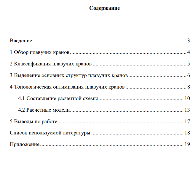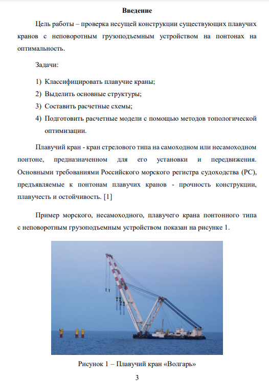 Цель работы – проверка несущей конструкции существующих плавучих кранов с неповоротным грузоподъемным устройством на понтонах на оптимальность. Задачи: 1) Классифицировать плавучие краны; 2) Выделить основные структуры; 3) Составить расчетные схемы; 4) Подготовить расчетные модели с помощью методов топологической оптимизации. Плавучий кран - кран стрелового типа на самоходном или несамоходном понтоне, предназначенном для его установки и передвижения. Основными требованиями Российского морского регистра судоходства (РС), предъявляемые к понтонам плавучих кранов - прочность конструкции, плавучесть и остойчивость. [1]