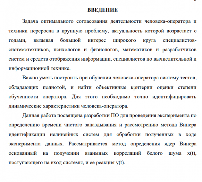 Задача оптимального согласования деятельности человека-оператора и техники переросла в крупную проблему, актуальность которой возрастает с годами, вызывая большой интерес широкого круга специалистовсистемотехников, психологов и физиологов, математиков и разработчиков систем и средств отображения информации, специалистов по вычислительной и информационной технике. Важно уметь построить при обучении человека-оператора систему тестов, обладающих полнотой, и найти объективные критерии оценки степени обученности оператора. Для этого необходимо точно идентифицировать динамические характеристики человека-оператора. Данная работа посвящена разработки ПО для проведения эксперимента по определению времени чистого запаздывания и рассмотрению метода Винера идентификации нелинейных систем для обработки полученных в ходе эксперимента данных. Рассматривается метод определения ядер Винера основанный на получении взаимных корреляций белого шума x(t), поступающего на вход системы, и ее реакция y(t).