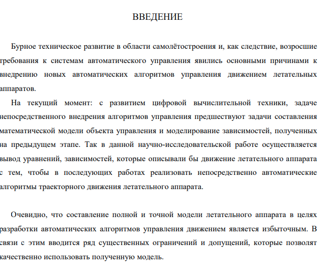 Бурное техническое развитие в области самолётостроения и, как следствие, возросшие требования к системам автоматического управления явились основными причинами к внедрению новых автоматических алгоритмов управления движением летательных аппаратов. На текущий момент: с развитием цифровой вычислительной техники, задаче непосредственного внедрения алгоритмов управления предшествуют задачи составления математической модели объекта управления и моделирование зависимостей, полученных на предыдущем этапе. Так в данной научно-исследовательской работе осуществляется вывод уравнений, зависимостей, которые описывали бы движение летательного аппарата с тем, чтобы в последующих работах реализовать непосредственно автоматические алгоритмы траекторного движения летательного аппарата. Очевидно, что составление полной и точной модели летательного аппарата в целях разработки автоматических алгоритмов управления движением является избыточным. В связи с этим вводится ряд существенных ограничений и допущений, которые позволят качественно использовать полученную модель.