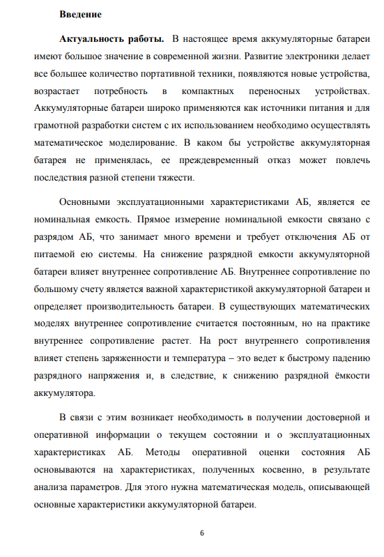 Введение Актуальность работы. В настоящее время аккумуляторные батареи имеют большое значение в современной жизни. Развитие электроники делает все большее количество портативной техники, появляются новые устройства, возрастает потребность в компактных переносных устройствах. Аккумуляторные батареи широко применяются как источники питания и для грамотной разработки систем с их использованием необходимо осуществлять математическое моделирование. В каком бы устройстве аккумуляторная батарея не применялась, ее преждевременный отказ может повлечь последствия разной степени тяжести. Основными эксплуатационными характеристиками АБ, является ее номинальная емкость. Прямое измерение номинальной емкости связано с разрядом АБ, что занимает много времени и требует отключения АБ от питаемой ею системы. На снижение разрядной емкости аккумуляторной батареи влияет внутреннее сопротивление АБ. Внутреннее сопротивление по большому счету является важной характеристикой аккумуляторной батареи и определяет производительность батареи. В существующих математических моделях внутреннее сопротивление считается постоянным, но на практике внутреннее сопротивление растет. На рост внутреннего сопротивления влияет степень заряженности и температура – это ведет к быстрому падению разрядного напряжения и, в следствие, к снижению разрядной ёмкости аккумулятора. В связи с этим возникает необходимость в получении достоверной и оперативной информации о текущем состоянии и о эксплуатационных характеристиках АБ. Методы оперативной оценки состояния АБ основываются на характеристиках, полученных косвенно, в результате анализа параметров. Для этого нужна математическая модель, описывающей основные характеристики аккумуляторной батареи.