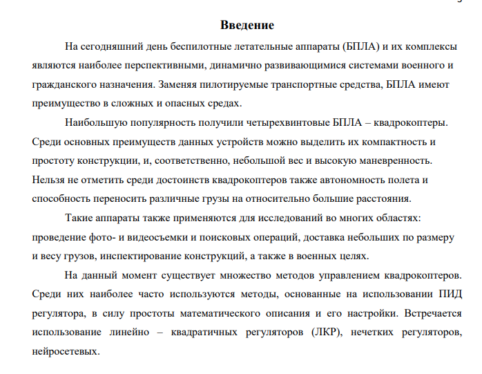 На сегодняшний день беспилотные летательные аппараты (БПЛА) и их комплексы являются наиболее перспективными, динамично развивающимися системами военного и гражданского назначения. Заменяя пилотируемые транспортные средства, БПЛА имеют преимущество в сложных и опасных средах. Наибольшую популярность получили четырехвинтовые БПЛА – квадрокоптеры. Среди основных преимуществ данных устройств можно выделить их компактность и простоту конструкции, и, соответственно, небольшой вес и высокую маневренность. Нельзя не отметить среди достоинств квадрокоптеров также автономность полета и способность переносить различные грузы на относительно большие расстояния. Такие аппараты также применяются для исследований во многих областях: проведение фото- и видеосъемки и поисковых операций, доставка небольших по размеру и весу грузов, инспектирование конструкций, а также в военных целях.