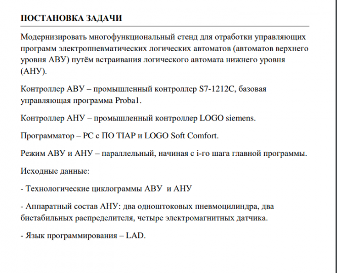 Модернизировать многофункциональный стенд для отработки управляющих программ электропневматических логических автоматов (автоматов верхнего уровня АВУ) путём встраивания логического автомата нижнего уровня (АНУ). Контроллер АВУ – промышленный контроллер S7-1212C, базовая управляющая программа Proba1. Контроллер АНУ – промышленный контроллер LOGO siemens. Программатор – PC с ПО TIAP и LOGO Soft Comfort. Режим АВУ и АНУ – параллельный, начиная с i-го шага главной программы. Исходные данные: - Технологические циклограммы АВУ и АНУ - Аппаратный состав АНУ: два одноштоковых пневмоцилиндра, два бистабильных распределителя, четыре электромагнитных датчика. - Язык программирования – LAD.