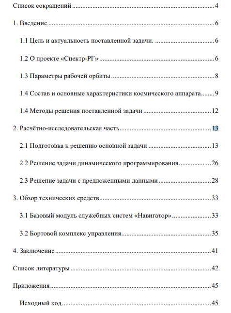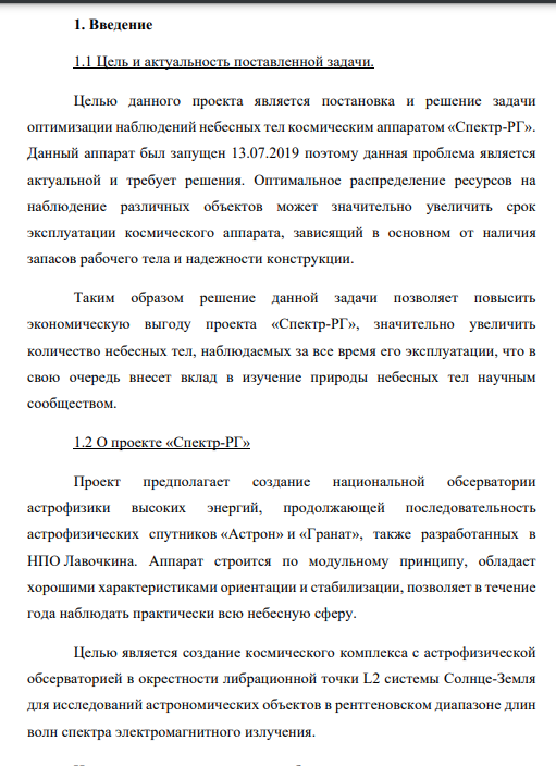 1.1 Цель и актуальность поставленной задачи. Целью данного проекта является постановка и решение задачи оптимизации наблюдений небесных тел космическим аппаратом «Спектр-РГ». Данный аппарат был запущен 13.07.2019 поэтому данная проблема является актуальной и требует решения. Оптимальное распределение ресурсов на наблюдение различных объектов может значительно увеличить срок эксплуатации космического аппарата, зависящий в основном от наличия запасов рабочего тела и надежности конструкции. Таким образом решение данной задачи позволяет повысить экономическую выгоду проекта «Спектр-РГ», значительно увеличить количество небесных тел, наблюдаемых за все время его эксплуатации, что в свою очередь внесет вклад в изучение природы небесных тел научным сообществом.