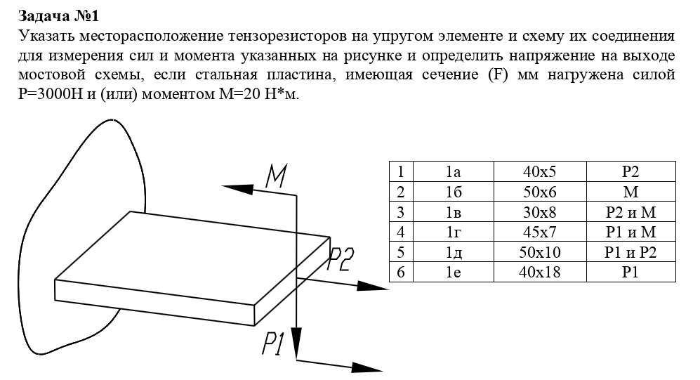 Задача №1 (В) Указать месторасположение тензорезисторов на упругом элементе и схему их соединения для измерения сил и момента указанных на рисунке и определить напряжение на выходе мостовой схемы, если стальная пластина, имеющая сечение (F) мм нагружена силой Р=3000Н и (или) моментом М=20 Н*м.