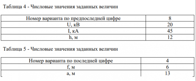 Задача 2 Грозовой разряд произошел в столб телефонной линии, расположенной на расстоянии а, м, от ВЛ напряжением U, кВ. Высота подвеса проводов на опорах ВЛ h, м, стрела подвеса проводов f, м. Зарегистрированная величина тока I, кА. Определить : 1. Величину индуктивного перенапряжения Uинд на проводах высоковольтной линии. 2. Кратность перенапряжения.