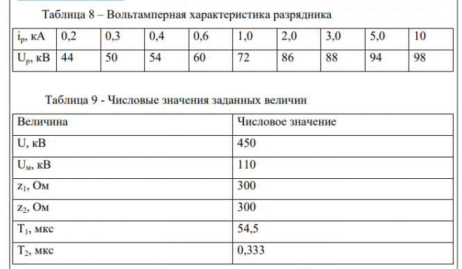 2. Построить график изменения напряжения на разряднике и защищаемом им оборудовании и дайте заключение об эффективности применения разрядника с данной вольтамперной характеристикой. Числовые значения заданных величин указаны в таблице 9.