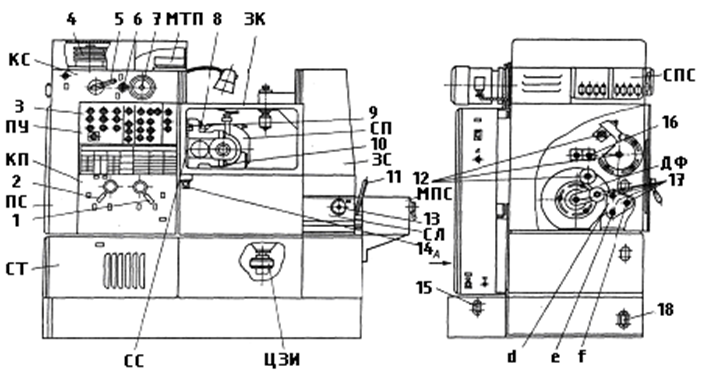 СТ | станина | 1,2 | рукоятки переключения подач |