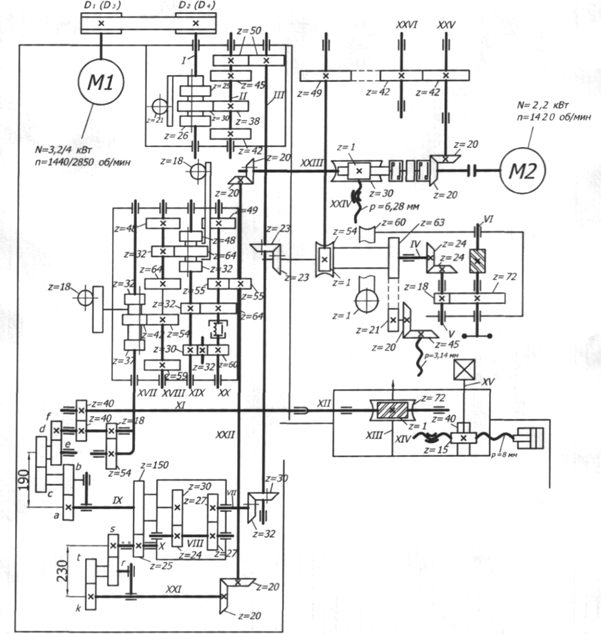 4. По кинематической схеме составить расчётные перемещения, уравнения кинематического баланса и вывести формулы настройки для следующих цепей: