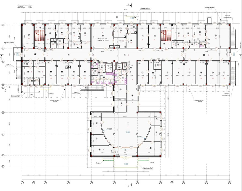 Размеры здания: по осям «А-Л» и «1-10» - 39,15*57,6 м Количество этажей: 3 (наличие подвального этажа) Высота здания: 14,6 м