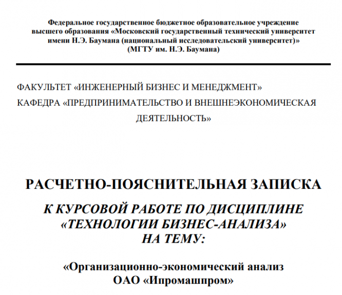 Главная » Учебные материалы » Технологии бизнес-анализа » Курсовые работы » МГТУ им. Н.Э.Баумана » 4 семестр » Организационно-экономический анализ ОАО Ипромашпром