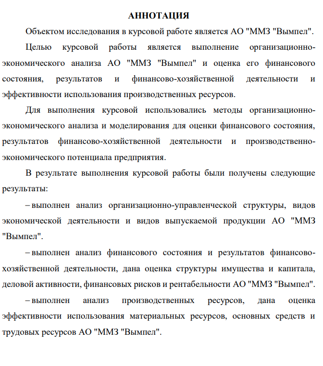 Целью курсовой работы является выполнение организационноэкономического анализа АО "ММЗ "Вымпел" и оценка его финансового состояния, результатов и финансово-хозяйственной деятельности и эффективности использования производственных ресурсов. Для выполнения курсовой использовались методы организационноэкономического анализа и моделирования для оценки финансового состояния, результатов финансово-хозяйственной деятельности и производственноэкономического потенциала предприятия.